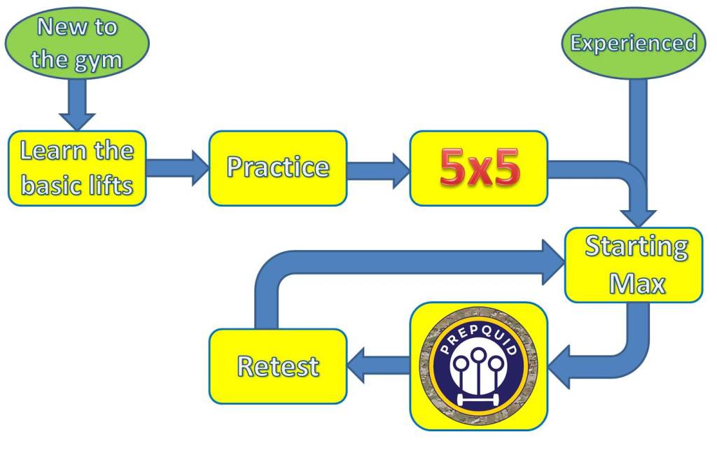 - There’s no need to jump straight into PrepQuid. A great sandbox programme called Stronglifts 5×5 is a good place for anybody to start – check out the simple A-B-A-B-A… structure here. It’s very basic, has a very limited number of exercises, starts with almost 0 weight, and will allow you to become familiar with the building blocks of all strength programmes in a structured manner. The programme follows a basic linear progression model which allows lifters to incrementally add weight on the bar on a session-to-session basis. When you feel like you’re ready for more of a challenge or when you eventually plateau, use the numbers that you’ve reached on the programme to go for a max effort/ 1 rep max attempt which you can then plug-in to the spreadsheet.